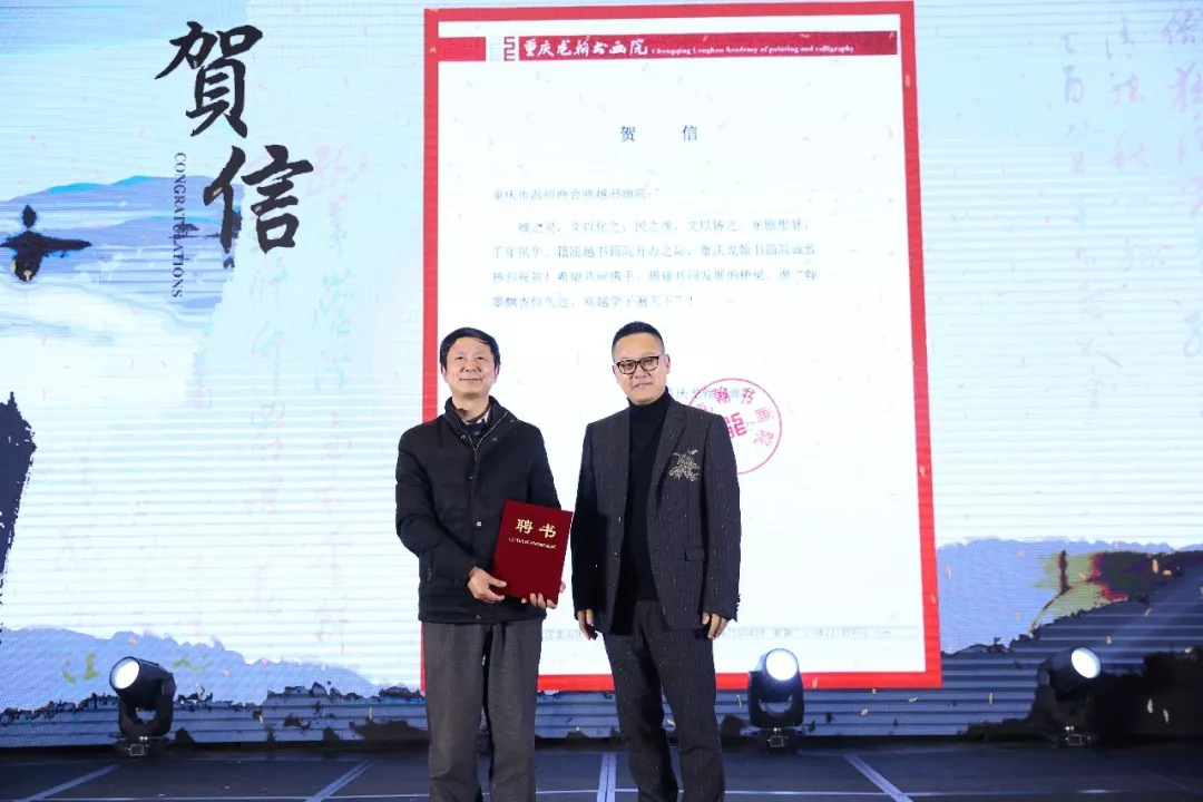 商会一直坚持着“创新办会、团结兴会、文化立会”的理念服务广大会员,先后成立了青年才俊俱乐部、太太俱乐部、网球俱乐部、尔雅女性学堂等组织。为搭建艺术交流平台、传承国学经典,促进商会文化建设,商会筹备成立了“瓯越书画院”,会上,市工商联党组副书记、副主席张莉为商会瓯越书画院进行授牌,常务副会长、瓯越书画院院长柯华荣上台接牌。柯华荣院长也为书院创始导师、重庆市书协副秘书长石珺先生颁发了聘书。