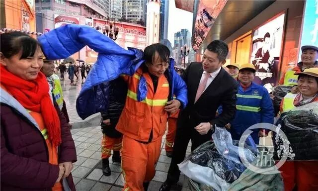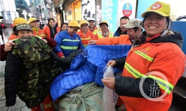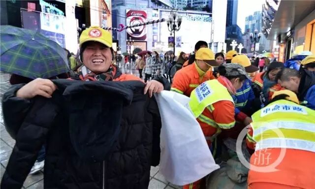 “他们说要工作到凌晨零点,听了之后心里突然就那么一紧。生活都不容易!”陈成宽说,他打听到解放碑步行街一共有50多位环卫工人,于是第二天就买了60件棉衣和羽绒服,赶在下班前送去。