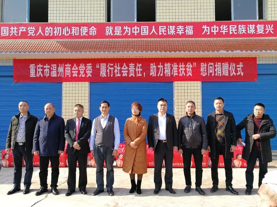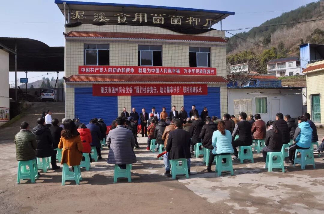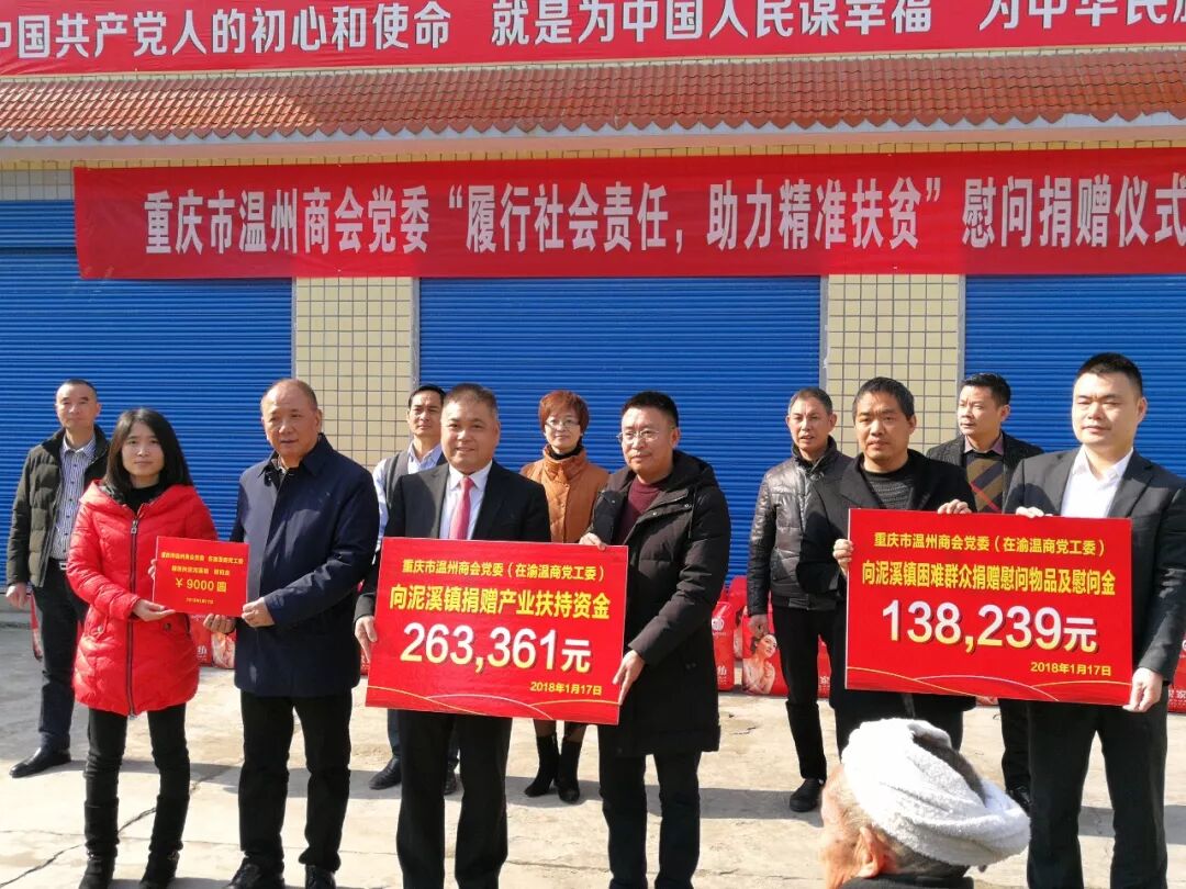 党委(在渝温商党工委)书记颜贻骥、副书记(在渝温商党工委委员)王孟、常务副会长陈可树代表党委向泥溪镇捐赠产业扶持资金、物品及慰问金
