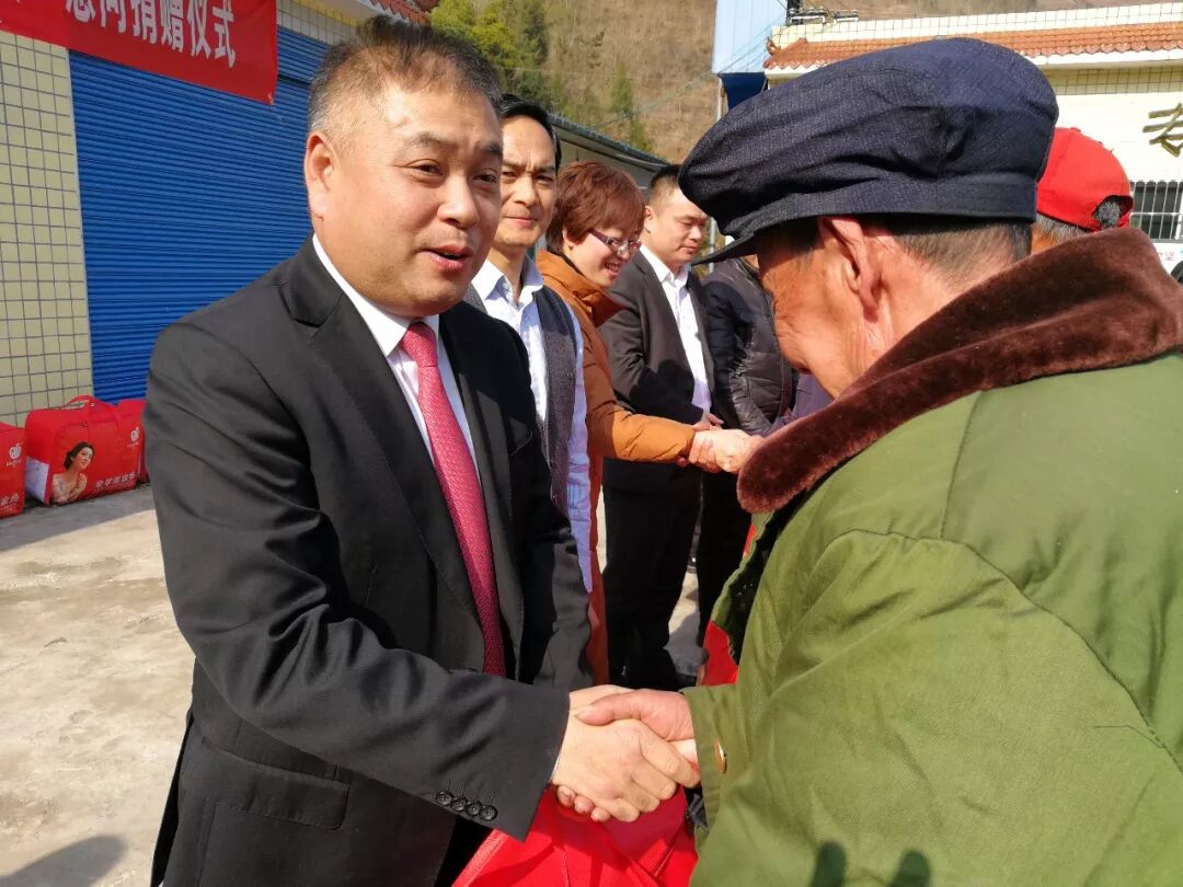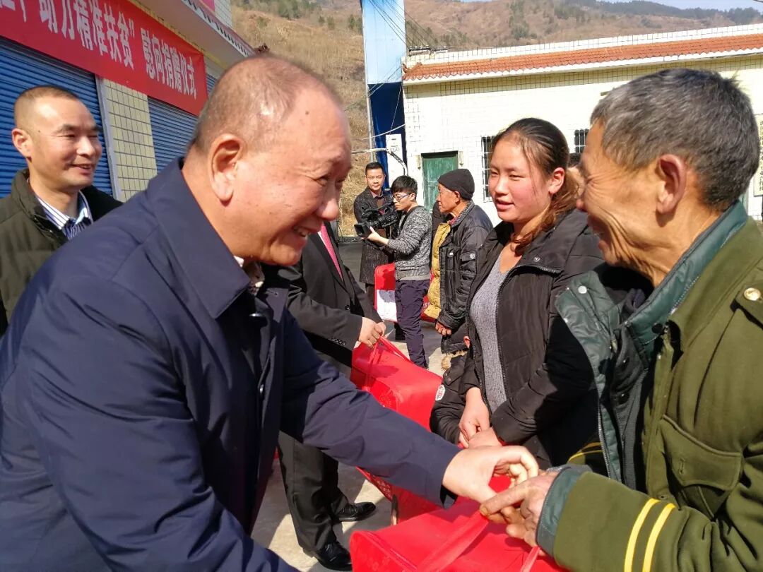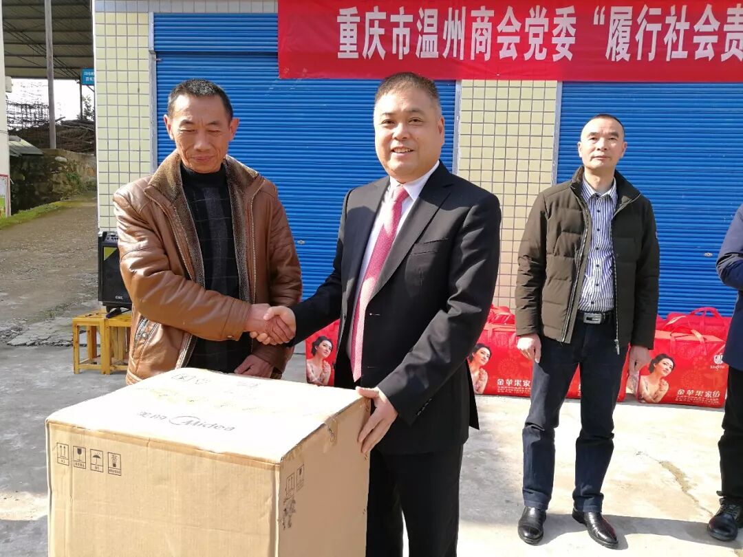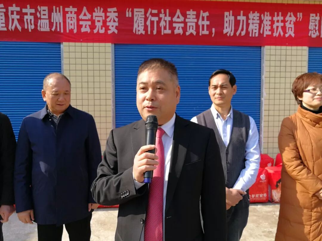 重庆市温州商会党委(在渝温商党工委)书记颜贻骥作了讲话,他首先向泥溪镇干部群众表示新春的祝福,并以自己从温州到重庆的20多年艰苦创业经历为例,鼓励村民们要把党和政府的关爱化着勤劳致富的动力,战胜贫困、走出困境。颜贻骥书记说,习近平总书记强调“全面建成小康社会,一个不能少”。这次捐赠活动也是商会党组织落实党的十九大精神,为打赢精准扶贫攻坚战尽绵薄之力。随后,党委书记颜贻骥、副书记王孟、党员常务副会长陈可树代表党委向泥溪镇困难群众捐赠冬被100床、家纺(三件套、四件套)100床、羽绒服30套,美的热水器1台,扶贫慰问金9000元;同时为泥溪镇捐赠产业扶持资金263361元。