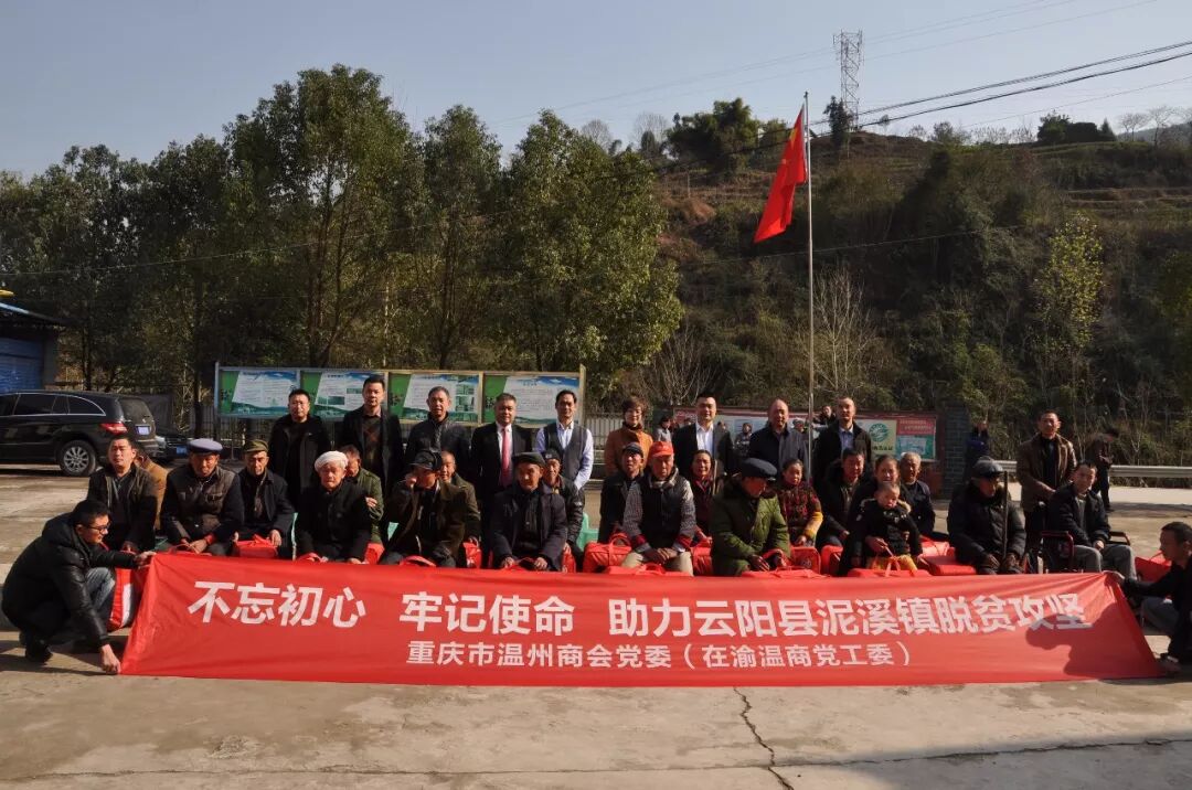 1月17日,数九严冬,暖阳高照。云阳县泥溪镇胜利村服务中心幅暖意融融,重庆市温州商会党委(在渝温商党工委)“不忘初心 牢记使命 精准扶贫 ——助力云阳泥溪镇脱贫攻坚慰问捐赠”活动在这里举行。活动由泥溪镇副镇长李志银主持。重庆市温州商会党委(在渝温商党工委)书记颜贻骥、副书记(在渝温商党工委委员)王孟、党委(在渝温商党工委)委员黄通满、商会党委委员缪明龙、党员常务副会长陈可树、第一支部委员季春鸟、党委办公室主任吕树芬参加捐赠活动。市政协办公厅扶贫集团驻泥溪镇脱贫攻坚工作队队长何礼兵、云阳县政协副主席熊玉梅、泥溪镇党政领导、现场接受捐助的泥溪镇敬老院老人、特困村民代表、新闻媒体记者等约50人,共同见证重庆市温州商会党委(在渝温商党工委)以实际行动贯彻落实党的十九大精神的实际行动。