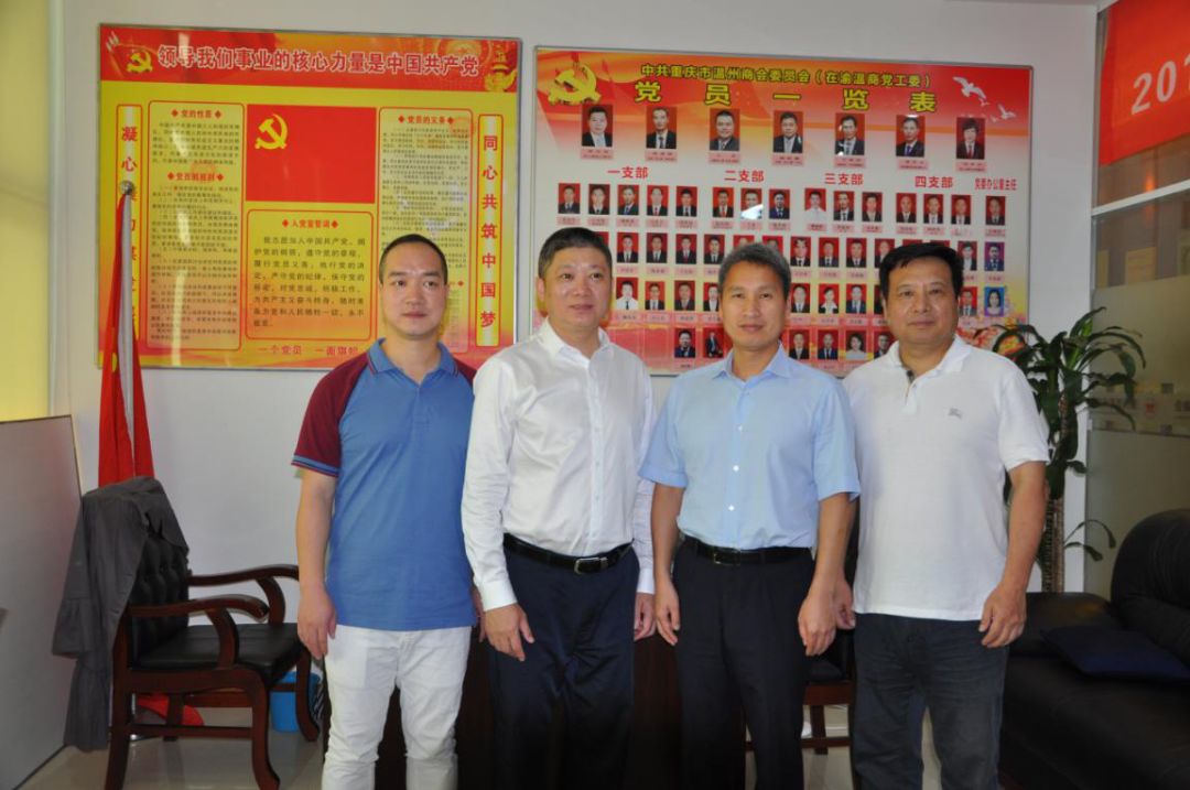 我会会长陈成宽(左二)、常务副会长黄承勇(左一)、永青科技董事长胡晓东(右二)、原温州市鹿城区经合办主任,党组书记姜扬烽(右一)在党委办公室合影留念。